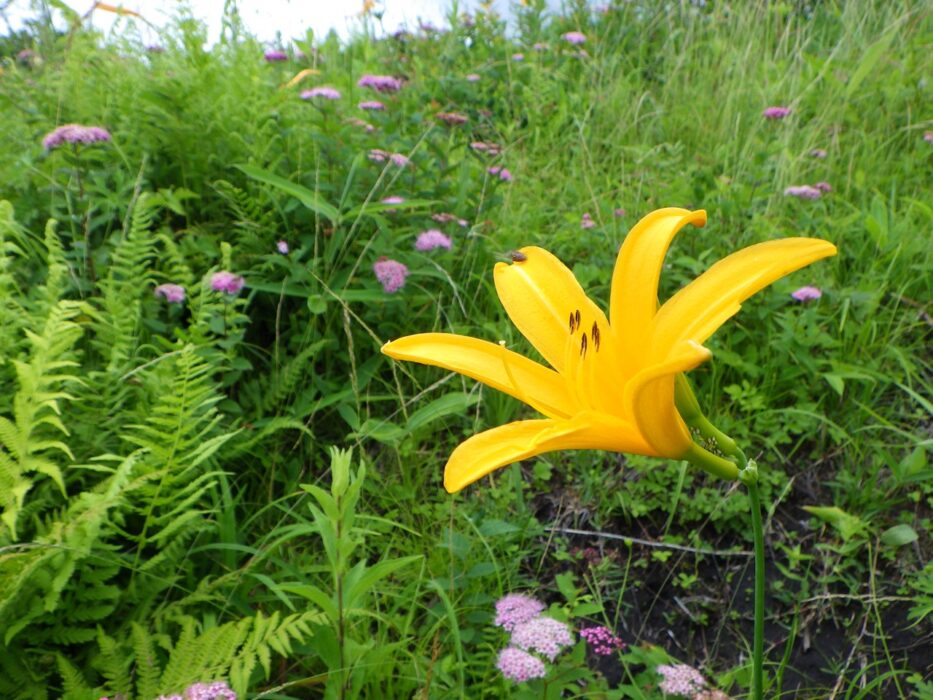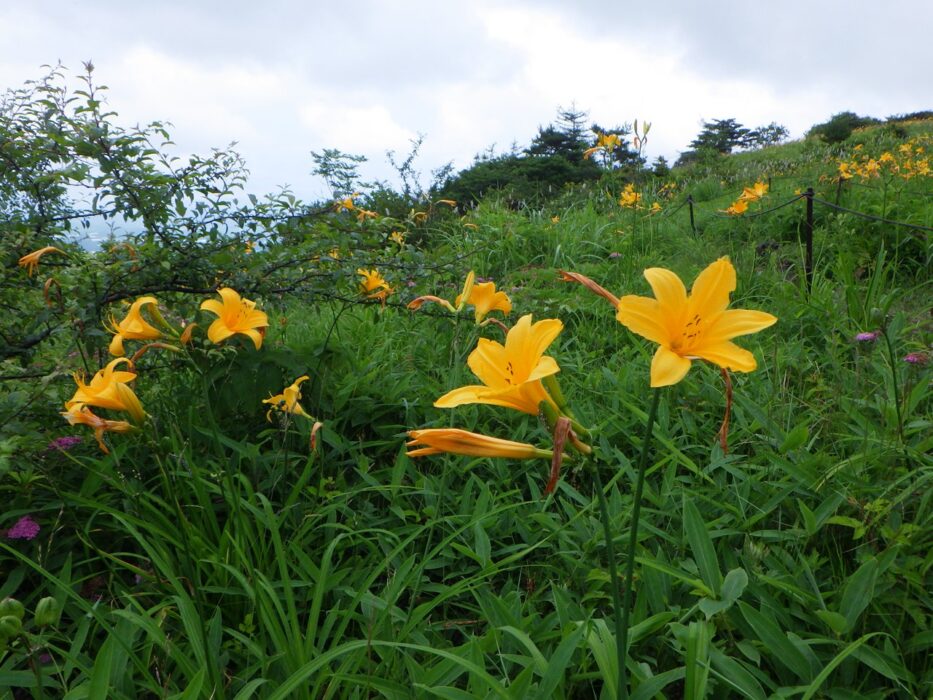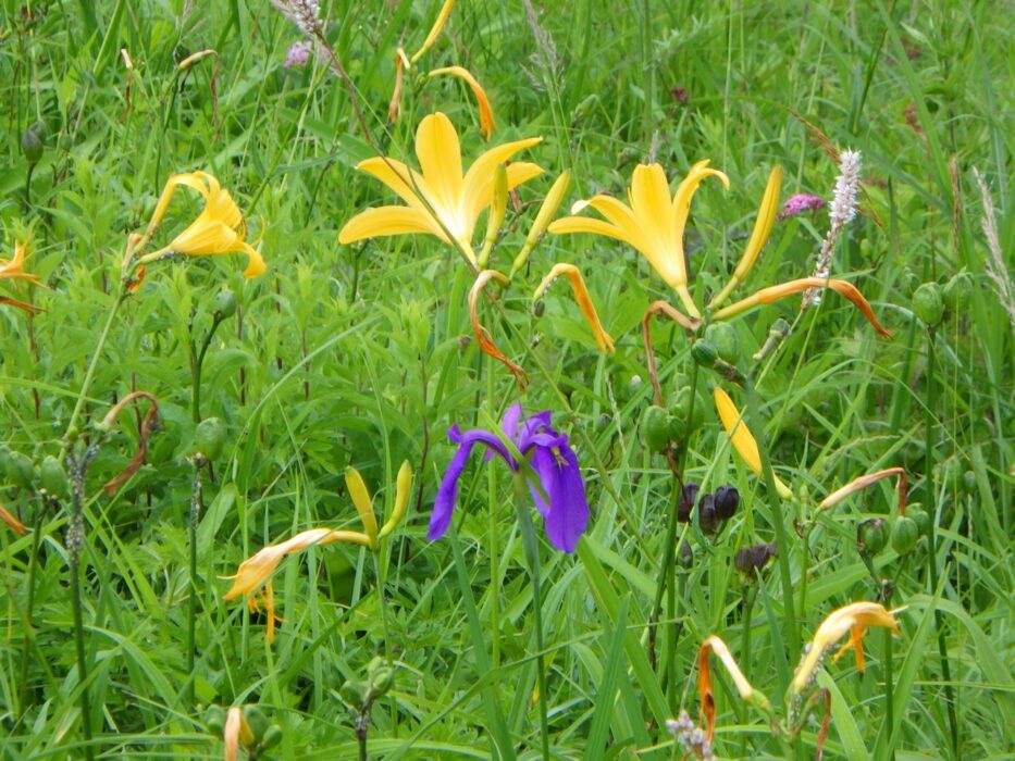 キスゲ群落の中にノハナショウブ