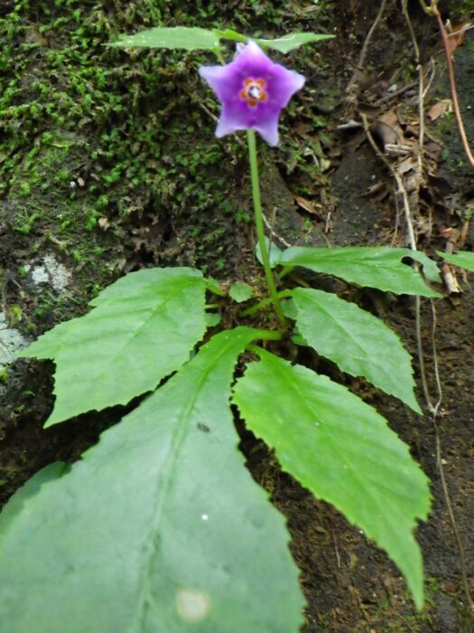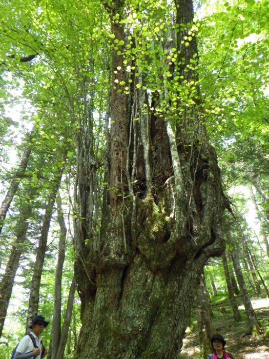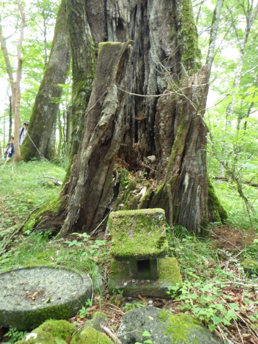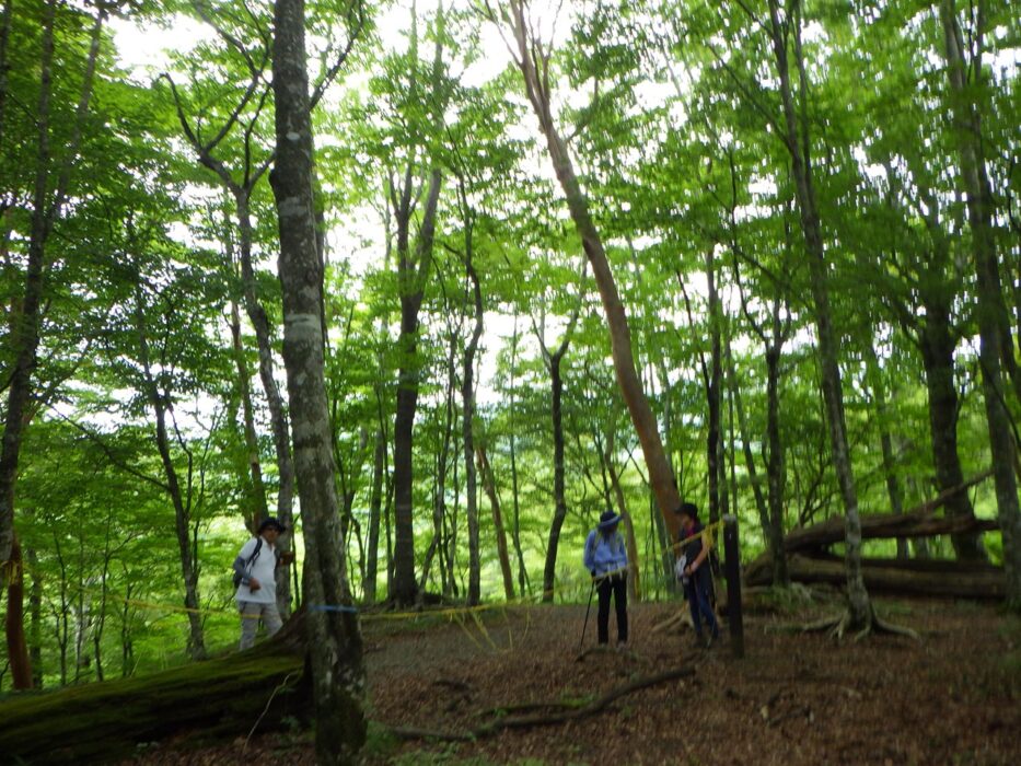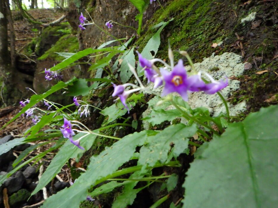 標高1300mから1500mぐらいの富士山の樹林帯はブナ、ミズナラ、カエデなどが生え緑豊かな所だ。夏は涼しく歩くと、小さな花にもあえる。西臼塚は富士山の側火山でおよそ3000~4500年前の噴火によってでき、丘ができている。階段を登っていくとブナやミズナラの大木があり、山頂からすり鉢の形の火口が見える。森の奥で溶岩に咲いてるイワタバコを発見、樹林に囲まれた所なので さすが葉が焼けずに咲き誇っている様は素晴らしい。